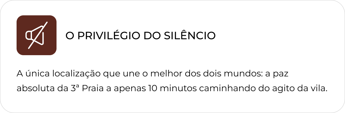 Somos vizinhos do agito, mas dormimos no silêncio. O Village está estrategicamente na Terceira Praia, conectado à Segunda Praia (onde estão os principais restaurantes e o agito noturno) por uma passarela plana e de fácil acesso. Em menos de 10 minutos de caminhada leve, você está no centro da badalação, mas na hora de descansar, você retorna para o sossego absoluto e o barulho apenas do mar. É a localização mais estratégica para quem quer conveniência sem abrir mão de uma noite de sono tranquila.