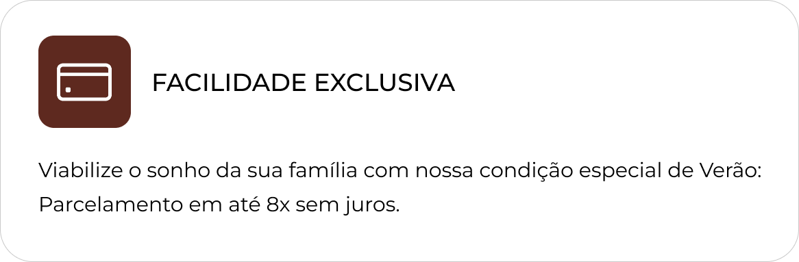 Reservar direto é garantir a melhor negociação. Aqui no nosso canal oficial, oferecemos condições exclusivas como o parcelamento em até 8x sem juros no cartão de crédito, além de ofertas personalizadas que você não encontra em outros sites. Fale com nossa equipe agora para garantir sua data com a melhor tarifa disponível.